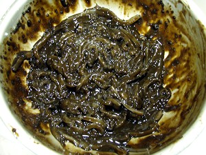 良くかき混ぜるとこんな色(L)、これを混ぜたら黒づくり完成(R)