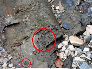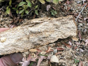 分厚い砂岩の層からなっている「大谷山層」では化石はあまりでないと言うことで観察のみ・・・砂岩の欠片だけを拾ってきました。ここで午前の部は終了、昼食会場&二つ目のポイントである「出会いの森」へと向かった。