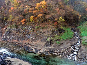 ポイント3の入り口は吊り橋(L)、庄川沿いのの「牛丸層」(R)