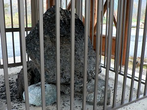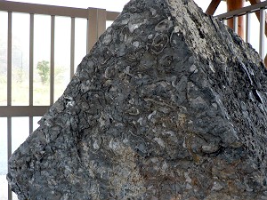 「牛丸ジュラ紀化石」 (L)、白く見えるのがカキの化石(R)