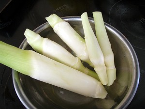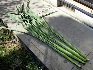 ということで、早速、収穫!といっても茎を包丁で切るだけ・・・とっても簡単だが、切り口からはびっくりするほど水が溢れてくる。まこもは凄く水を吸う植物で、朝にバケツから溢れるほど水を入れても、夕方にはほとんど無くなっているくらいだが、これを見るとある意味、納得である。