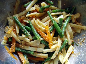 二品目は「まこもとさやいんげんの胡麻和え」・・・こちらも「信州平谷村のまこもたけ料理レシピ」を参考に。なんで、胡麻和えにしたかと言うと、単に「さやいんげん」と「胡麻和え」が大好きだから・・・。