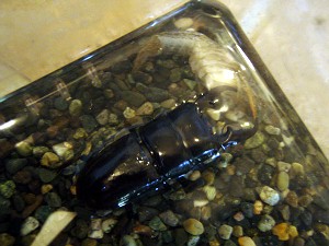 それは・・・セレゾウはじめ穏健派のクワガタたちの昆虫ゼリーを交換している途中、同じく玄関にあるアメリカザリガニ(今年生まれ)の水槽に目をやると何か黒いモノが・・・。