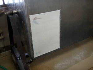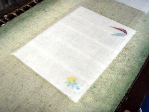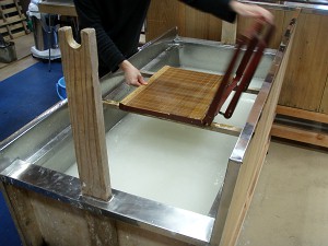 原料が入った「ふね」と紙を漉く「わく」(L)、漉いたら押し葉を置いて(R)