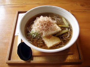 体験後、手打ちそばの「拾遍舎」で(L)、「豆腐そば」(R)