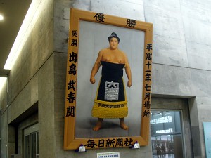 エントランスを入って目に付いたのが、金沢市出身の(元)大関 出島関の優勝額・・・1999年の夏場所のものだから、ちょうど10年前 (ToT)・・・間近で見たのは初めてだけど思っていた以上に大きい。国技館の天井(ではないけど)に飾るのだから、当たり前だといえば当たり前だが・・・いやーでっかい。でも、できれば(元)横綱 輪島関の額も見たかった・・・本人は間近で見たけど(^o^)