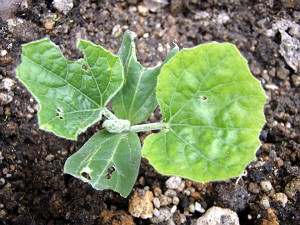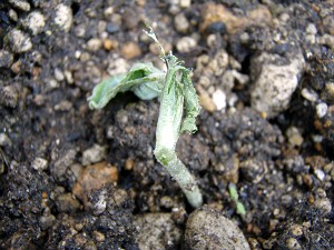 さらに、目を先週末に定植したヒョウタンに移すと・・・昨日までちゃんと本葉2枚まで展開していたはずの苗が消えていた・・・そして、もう一本も双葉と本葉1枚が食べられていた。