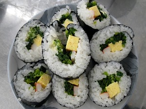 今回の「太巻き寿し」、具材は「二塚からしな」、 「厚焼き玉子」、「ロイヤルカリブ」、味付けは「マヨネーズ」である。寿司簾の上に海苔を置き、上端1cmを除いてすし飯をまんべんなく敷いたら、具材を 並べて、いよいよ巻き開始・・・で、出来上がったのは下左の写真・・・めでたく巻くことは巻けたのだが、ベテラン姉さんが作ったもの(下右)に比べて具の 少なさが一目瞭然・・・おやじの遠慮がちな性格が出たわけだが(笑)、これならうまく巻けて当然かも・・・。