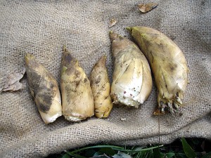 早速、Mさんに掘ってもらうと(掘るのはとても難しいのだ)、思った以上に小さいタケノコが姿を現した(右下写真の一番左のタケノコ)。ま、それでも初物&地物ですから・・・。