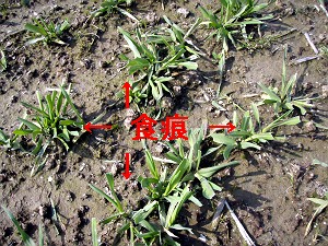 何はともあれ、実際に畑を見てみないと判らないわけで、一枚、一枚、降りては確認・・・すると・・・やっぱりちゃんとありましたねぇ。いつもの様に、葉っぱの先っぽが食べられてました・・・左の写真みたいに。