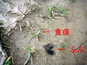 中には、食べられたばっかりという新鮮な食害もあったりして、ちゃんとお印も残してありました(右の写真)。農家の方の話では、マーキングをしながら、その回りを食べていくんだそうで・・・レンコンの食害になると臭くて売り物にならないそうな。いやはや困ったもんです。