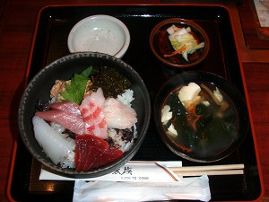 本日の能登丼「奥能登味覚散歩」(L)、大葉の下の「ナメナメ」が独特の味を(R)