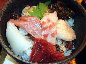休日とはいえ、お昼時間の真っ最中、ほぼ満席で、思った以上の時間が掛かって「奥能登味散歩」が登場!!ご飯の上には魚、イカ、ギンバサ、岩のり・・・そしてイカの内臓で作る「ナメナメ」がたっぷりと・・・これにイシリを掛けるとこれがまた美味くて・・・が、「ナメナメ」にはお酒がかなり混じっていて、食べたかったはずの小僧には気の毒なことに・・・(´・ω・`)