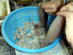 イカめし作りの基本装備(L)、お米に刻んだゲソを混ぜてイカに詰める(R)