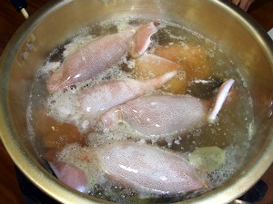 準備完了(L)、出汁の中に入れ煮立ててお酒を入れる(R)