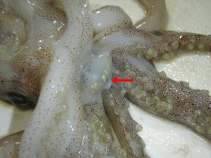 出来上がる間にイカの勉強(L)、左の♀の口に刺さった♂の精莢(R)