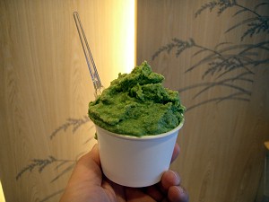 今日、ケースの中に並んでいたのは「ミルク」、「チョコチップ」、「抹茶」、「いよかん」の4種・・・お試しに定番の「ミルク」を味あわせて貰った(すげーうまかった)ので、「いよかん」をオーダーしたのだが、大人気ということで残念ながら品切れ・・・「ミルク」に惹かれつつも、ちょいと捻くれて「抹茶」をチョイス!こちらも「ミルク」と同じくらいにさっぱりした甘味で実に美味しかった。