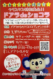 ドアラde ショコラのクリスマス特別バージョンが、先着200名様限定で発売されるというお知らせだ。なんでも、今回は今まで(第1~3弾)の倍のサイズだそうだ。当然、お値段も倍!と思ったら・・・なんと倍以上の3,371円(第1~3弾は1,575円)だった(´・ω・`) 絵にお金がかかるからだろうか?