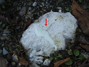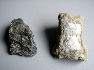 希塩酸で泡が出たら「結晶質石灰岩(大理石)」(L)、収穫物1・2「飛騨片麻岩・結晶質石灰岩」(R)