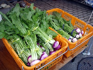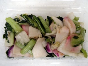 名産「穴馬かぶら」(L)、1パック150円の浅漬けウマー(R)