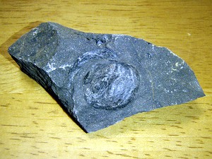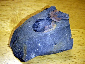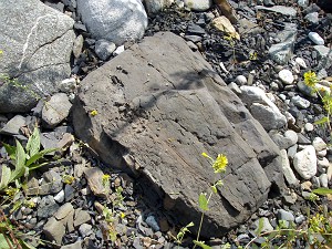 河原に降りて、見つかりそうな石&化石についてのレクチャーを受けたら、早速、採集開始である。この河原で化石が見つかるのは、見つけたら即化石の「爪石」と恐竜時代の化石が見つかるという「黒色泥岩」である。当然、「黒色泥岩」を探すわけだが、ほとんどが風雨にさらされボロボロに砕けている。とはいえ、何が出てくるかわからないから、ボロボロの石を丁寧に確認しながらより分けていく・・・オヤジには苦手な作業であるが、いきなりヒット?割れていたところから、貝の化石が出てきたのだ。しかも、なかなか良い感じ(^o^)