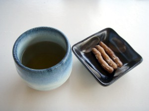 席に着いたら「そば茶」と「そばかりんとう」(L)、にわかそば(800円)(R)