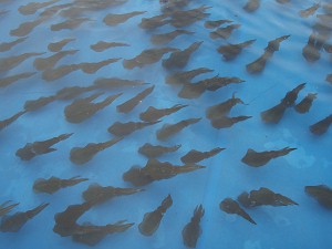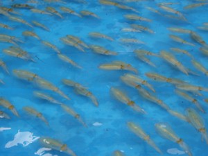 アオリイカ2態:変色前が透明(L)、興奮すると茶色に変化(R)