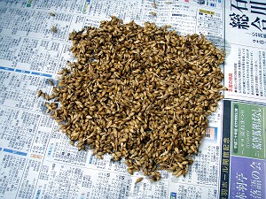ちなみに今回使った大麦の量は約200cc・・・とにかく初めてなので欲張らないのが一番・・・それと相変わらずの怪しげな空模様なので、あまり多すぎると今日中に乾かないことにもなりかねない・・・これをボウルでさっと洗って、ザルにあげて水を切り、新聞紙の上に広げて、あとはお日さまにお願いだ!!