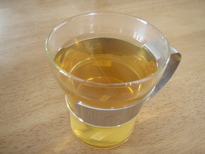 煮出しは鍋で水の状態から5分ほどで・・・大麦を取り除いたら、お待ちかねの自家製麦茶の出来上がりである\(^O^)/ 市販のものより色は薄いが、なかなか綺麗!!