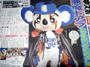 と、いうことで、非常に不本意ながら中スポを購入・・・たしかに一面トップに悪魔になってしまった先生が・・・帽子には「獄」のマークが・・・どうやら我がタイガースを地獄に落としてやるということらしい。うへぇ・・・。