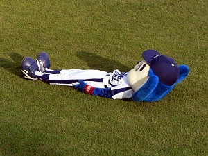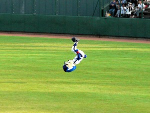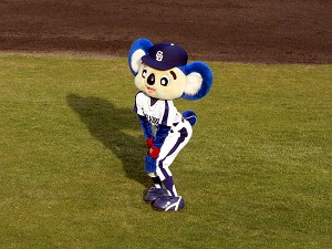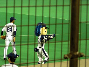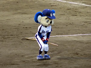 と、こことで地元富山のBCL・富山サンダーバーズのマスコット、ライティーくんが登場(ブログによれば遠くから見てたらしいが・・・)、喜ぶ先生、喜ぶライティーくん!!お友だちも大きなお友だちも大喜び、地元テレビのカメラマンも大喜び。しかし、先生は唐突にみんなをほっぽり出し、脱兎のごとく球場へ!やっぱり先生は先生である。
