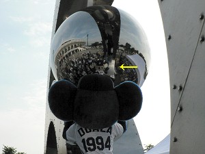 モニュメントのボールに写った姿と戯れる先生(L)、大仏のつもりか(R)