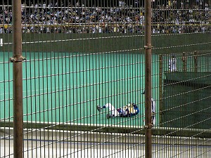 外野でお得意の体育座り(L)、今日のバク転は成功(R)