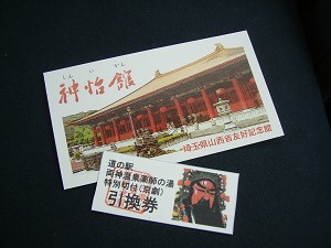 旧両神村の神飴館(L)、入場券と特券引換券(R)