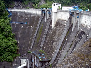 今回唯一のロックフィル・有間ダム(L)、試験湛水中の滝沢ダム(R)
