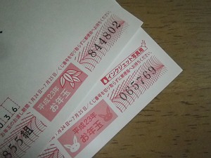この3年間、 H20:3/150→H21:1/150→H22:4/150 と推移していたので、今年は当選確率通りか、下回るか、どちらか一つだと勝手に予測していたお年玉付き年賀はがき、今日、抽選が行われた。