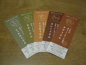 これで、釜揚げうどん(並)が一杯サービスとなるわけだが・・・この 「丸亀のこだわり札」は 表7種類、裏3種類の計10種類あって、このうちまだ「ぶ」、「笊」、「と」、「伽」、「掛」の表5種類しか集まっていない・・・ということで、サービスは暫くご遠慮・・・引き換えまではまだ2ヶ月以上もあるし。食欲は収集欲には勝てないのだ(笑)