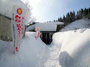 こうしてなんとか辿り着いた道の駅「桜峠」は・・・すっぽり雪の中にあった。おなじみの看板は半分近く埋もれているし、駐車場はいつもの半分ほどになっているし(それだけでもありがたい)、バス停も電話ボックスも頭しか出ていないし、売店は1m以上の雪の壁の間を抜けた先にあった。まるで東北や新潟の道の駅である。