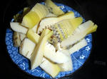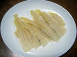 まずは「たけのこの刺身」である。とりあえず、試しにそのままスライスして食べてみたが、新鮮とはいえやっぱりそれなりのえぐみが・・・(´・ω・`)やはり白子でないと無理かも・・・で、下ゆですることに。あとはうすくスライスし、酢味噌をつけていただくだけ。小ぶりな分だけ、柔らかくてうまい。わさび醤油でもうまそうだ。