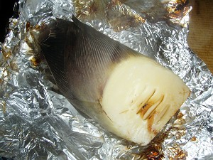 20分ほどすると良い臭いがしてきたので、根元の辺りを竹ぐしで刺してみる。すーっと入ったのでこれで出来上がり!軍手をはめてアルミホイルをはずし、さらに皮を一枚一枚むいていく。包丁で半分に切ると、一気に良い香りが・・・実に美味そうだ。