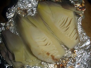 作り方はいたってシンプル・・・さっと水洗いして、1~2枚皮をむき、穂先を斜めに切り落とし、縦に切り目を入れ、アルミホイルで包み、オーブンで20~30分焼