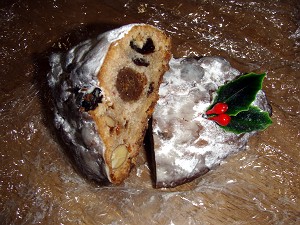 帰って、早速、まず一口・・・外側は思ったより堅めだったが、中はしっとり、フルーツたっぷり・・・本場のものは食べたことがないのでよく分からないけど、なかなか美味しい。思ったより、バターの風味がしなかったのがちょっと残念といえば、残念・・・本場物だとどうなんだろう?