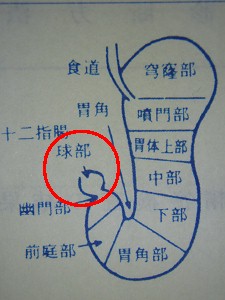 こうなりゃ、ググるしかないわけで、ググってみたところ、「球部」とは「十二指腸の始まり」のことのようで、「球部変形」とは「十二指腸潰瘍」を繰り返すなどして起こった変形のことらしい。だから「胃外性」で、「球部」の「変形」なわけだが・・・そんなのわかんねーよっ!!