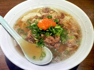 で、早速、注文・・・見てのとおり麺の上に煮込んだ豚肉がのっていて、さらにその上にネギとゆず紅葉おろしがのっている。麺は細めで、スープは塩ベースである。