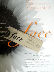 で、その三連休初日は、友人のCさんが参加しているDANCE PERFORMANCE “face” を観に行ってきた。もっともダンスに詳しいわけでも、造詣が深いわけでもない・・・身内にダンサー・振付家がいたりもするのだが・・・。ちなみに観客は女性95%、男性5%・・・当然、オヤジは極めて少数であった(^_^;)。