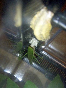 で、月曜日(24日)にショウリョウバッタを食べておなかが大きくなったあとも、そのまま萎まないままだったので、そろそろ産卵かな?と思っていたのだが・・・さっき、ケースを覗いたら・・・産卵が始まっていた。