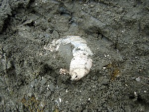見つけたら今度はハンマーとタガネ、クギで掘るわけだが、気を付けないとあっという間に割れてしまううので、もっと大変だ。最初に見つけた貝は結構良かったのだが、ちょっと焦って近くを掘ったら・・・割れてしまった (´Д`)